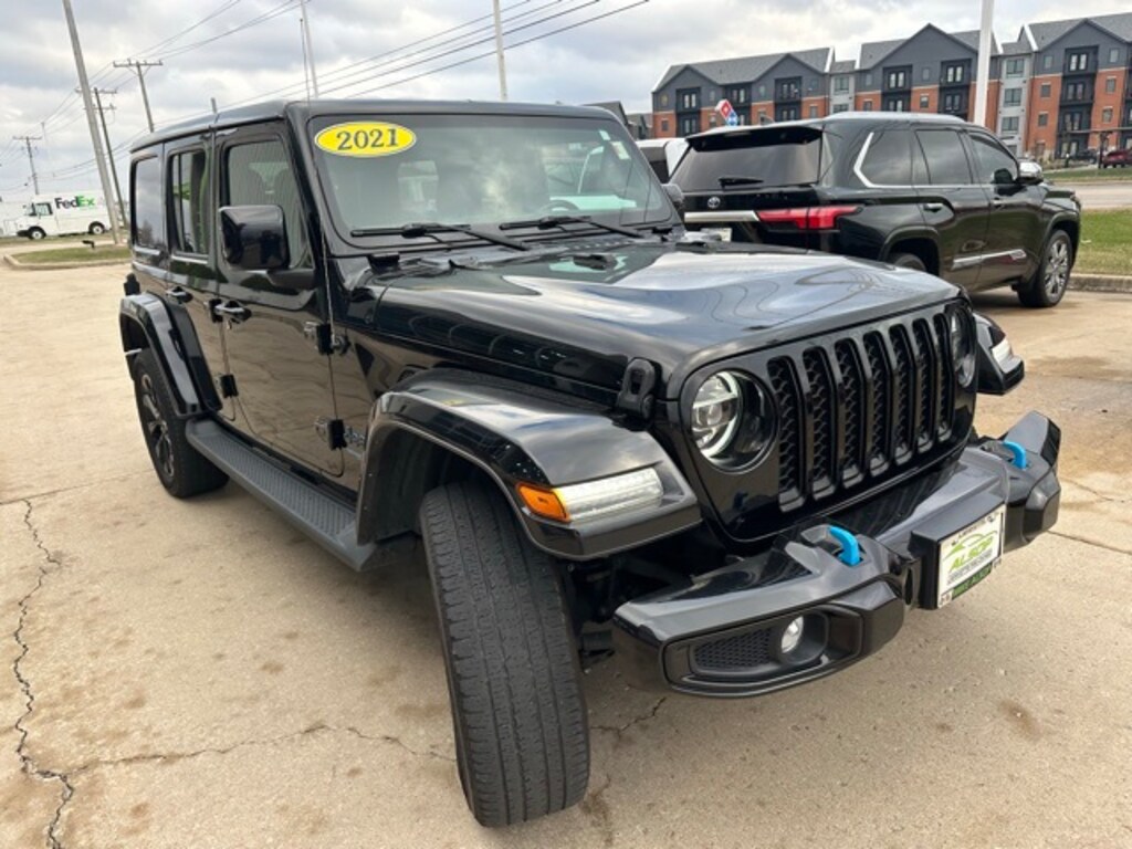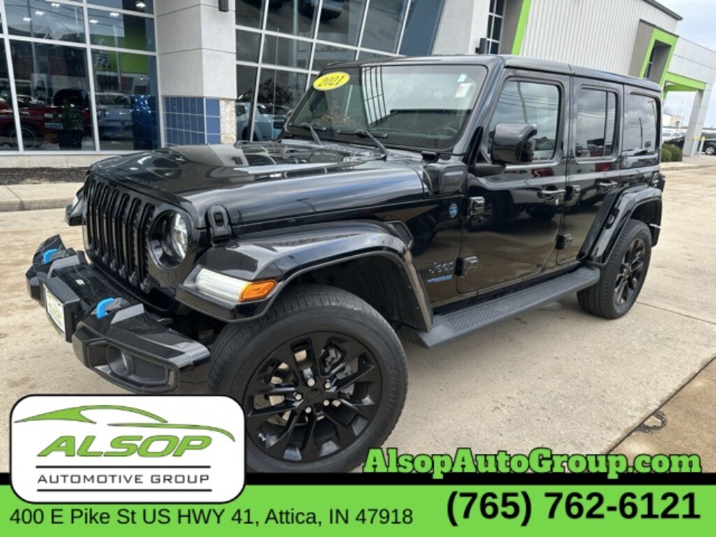 CARFAX One-Owner. Black Clearcoat 2021 Jeep Wrangler Unlimited Sahara 4xe 4WD 8-Speed Automatic 2.0L I4 DOHC Fresh Oil Change, 2.0L I4 DOHC, 9 Speakers, Apple CarPlay/Android Auto, Auto-dimming Rear-View mirror, Automatic temperature control, Blind Spot & Cross Path Detection, Blue Tow Hooks, Body Color 3-Piece Hard Top, Body Color Door Handles, Body Color Exterior Mirrors, Body Color Front Bumper, Body Color Grille w/Gloss Black Rings, Body Color Power Locking Fuel Filler Door, Body Color Rear Bumper w/Step Pads, Caramel Interior Accents, Cold Weather Group, Emergency communication system: SiriusXM Guardian, Freedom Panel Storage Bag, Front dual zone A/C, Garage door transmitter, Heated Front Seats, Heated Steering Wheel, High Altitude Package, Leather Shift Knob, Leather steering wheel, Leather Trimmed Bucket Seats, Leather Trimmed Seats w/Sahara Logo, Leather Wrapped Park Brake Handle, Low tire pressure warning, Navigation System, Occupant sensing airbag, ParkSense Rear Park Assist System, Premium Dark Exterior Accents, Quick Order Package 29N High Altitude, Radio: Uconnect 4C Nav w/8.4" Display, Rear Window Defroster, Rear Window Wiper/Washer, Remote keyless entry, Remote Proximity Keyless Entry, Remote Start System, Safety Group, Summit Badging, Wrapped I/P Bezel w/Caramel Stitch.
